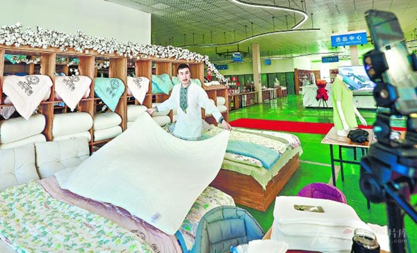 8月12日,呼图壁电子商务科技产业园工作人员在直播带货。该产业园集电子商务、仓储物流综合服务、直播带货、电商培训等功能于一体,自运营以来已发货50万单。 □石榴云/新疆日报记者李瑞摄