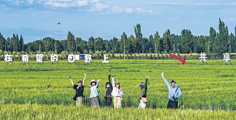 8月8日,游客在察布查尔锡伯自治县纳达齐牛录乡的稻田游览。该乡以传统农业为根基,以观光旅游为画笔,描绘一幅产业兴、乡村美、农民富的画卷。
