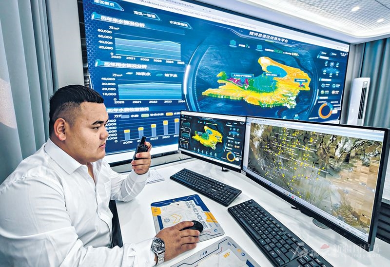 8月5日,精河县大河沿子镇九分闸信息化调度分中心,工作人员在监测农田灌溉情况。作为当地农业灌溉的“主力军”,大河沿子灌区覆盖周边25个村组、22万余亩耕地。