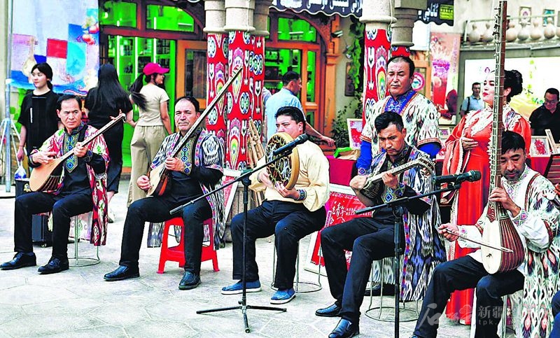民间艺人在和田团城景区2025“新疆是个好地方”非遗援疆主题展示分会场活动中奏响欢快的乐曲。 □才让东主摄