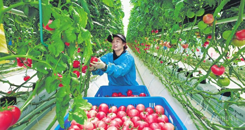 8月16日,工作人员在霍尔果斯现代农业科技产业园智能大棚里采摘番茄。该产业园智能大棚的番茄产量是普通大棚的7倍到10倍,每亩产值达40万元。 □石榴云/新疆日报记者 李瑞摄