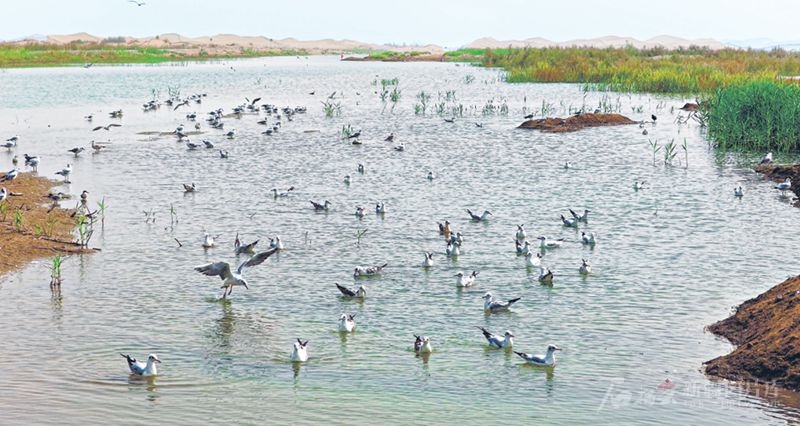 初秋时节,墨玉县雅瓦乡境内,成群的红嘴鸥在湿地聚集,为苍茫大漠注入灵动生机。该县通过引洪灌溉,在沙漠边缘形成一幅沙水相拥、候鸟欢鸣的和谐美景。 □赵飞摄