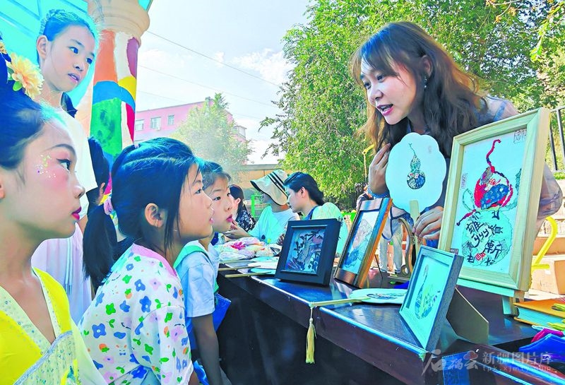 8月16日,在乌鲁木齐市水磨沟区华光街街道举办的非遗集市上,李晶晶在介绍锦灰堆作品。