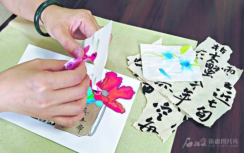 “您看这幅锦灰堆作品,它将书法与绘画精妙地融合在一起。‘锦’代表精致美好,‘灰’象征残破古旧,‘堆’则是把残缺的珍贵字画重新组合,赋予它们新生——这正是锦灰堆的独特魅力。”8月16日,在乌鲁木齐市水磨沟区华光街街道举办的非遗集市上,锦灰堆乌鲁木齐市非遗代表性传承人李晶晶向前来参观的居民介绍这项古老技艺。