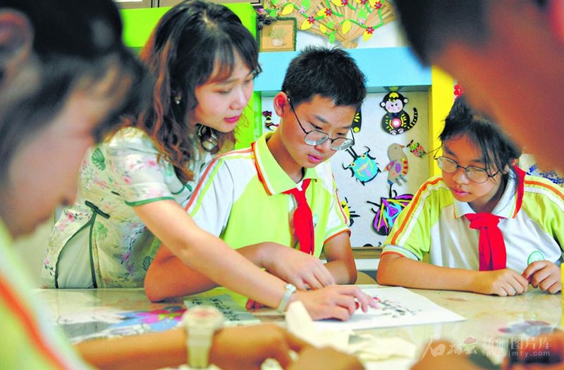 6月23日,在美术课上,李晶晶指导学生创作锦灰堆作品。