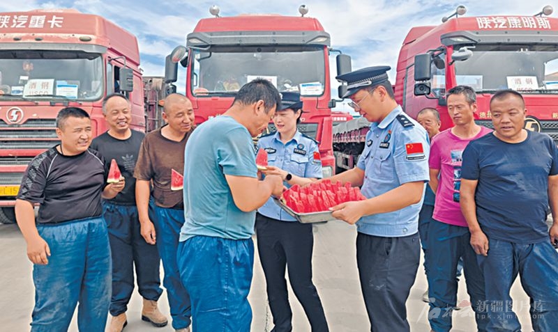 8月14日,新疆出入境边防检查总站老爷庙出入境边防检查站民警,给候检的货车司机送来西瓜降温。连日来,地处戈壁的老爷庙口岸气温高达40摄氏度,边防检查站为出入境司机和旅客免费提供绿豆汤、酸梅汤、西瓜等。 □潘靖元摄