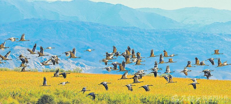 秋光正好,一群蓑羽鹤在阿勒泰市阿苇滩镇萨斯克巴斯陶村湿地上空飞翔。 近年来,阿勒泰地区加大草原、湿地保护力度,生态环境日趋向好,阿勒泰已成为鸟类迁徙途中停留、觅食、繁殖的天然场所。□阿尔达克·拜斯汗摄