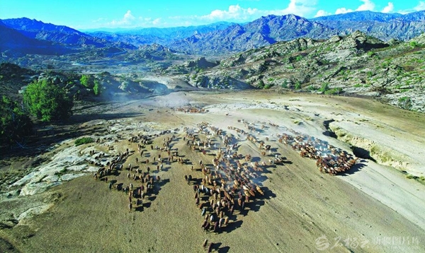 8月22日,福海县喀拉玛盖镇牧民赶着牲畜行进在秋季转场路上(无人机摄)。每年秋季,阿勒泰地区数百万头(只)牲畜从高山夏牧场转往山下的秋牧场。 □阿尔达克·拜斯汗摄