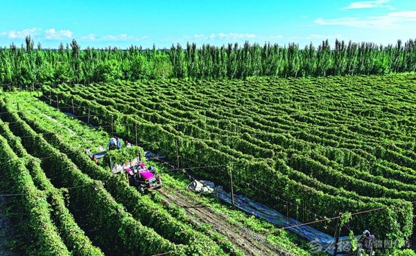 8月26日,职工在兵团第二师25团6连的玖昕种植专业合作社种植基地采收啤酒花(无人机摄)。近年来,该连通过科学管理和先进工艺生产加工的干啤酒花热销疆外市场。 □谢江林摄