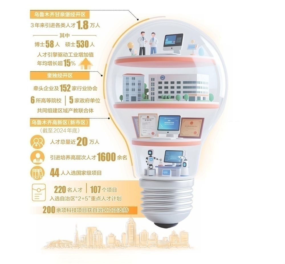 截至2024年底,乌鲁木齐高新区(新市区)人才总量近20万人,引进培养高层次人才1600余名,44人入选国家级项目,220名人才、107个项目入选自治区“2+5”重点人才计划,200余项科技项目获自治区立项支持。高层次人才成为乌鲁木齐高新区(新市区)重点产业集群创新驱动的生力军和引领者。