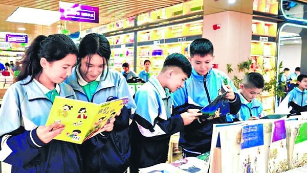 8月24日,学生们在伽师县新华书店读书、购书。开学季,当地不少中小学生纷纷走进书店选购书籍,迎接新学期。 □阿力米热·亚森摄
