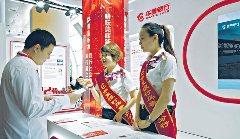 华夏银行乌鲁木齐分行工作人员为参加北京—新疆经济合作洽谈会的嘉宾现场讲解该行特色金融产品(8月12日摄)。