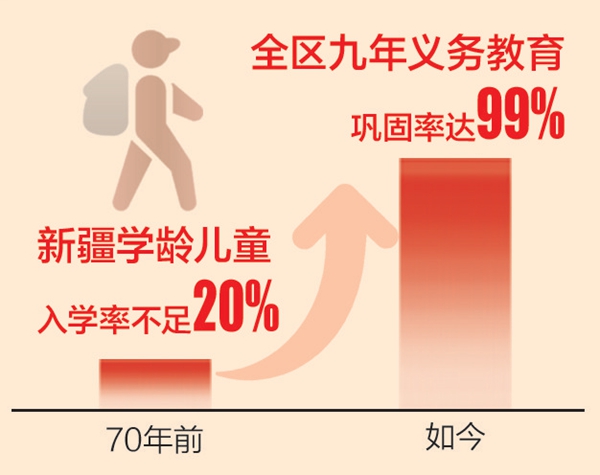 从青壮年扫盲到全覆盖控辍保学,从普及九年义务教育到迈向义务教育优质均衡发展,70年来尤其是党的十八大以来,新疆全面推进义务教育免试就近入学全覆盖,强化控辍保学属地管理职责,优先做好随迁子女、留守儿童和残疾儿童入学保障,如今,全区九年义务教育巩固率达99%,高于全国同期平均水平3.2个百分点。进城务工人员随迁子女在公办学校就读比例为99.16%,比全国同期平均水平高8.26个百分点。