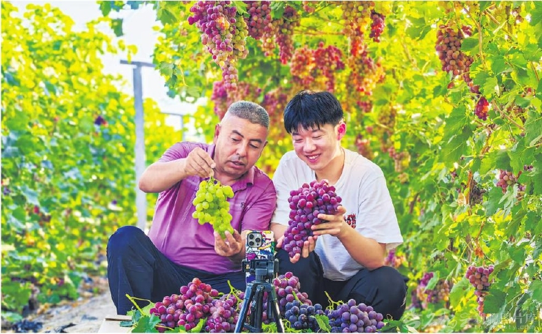 8月28日,乌苏市夹河子乡红房子村村干部在葡萄种植基地帮助果农直播带货。今年以来,该市各村(社区)党员干部带头开展直播助农活动,推动农产品销售。□李仁锡摄