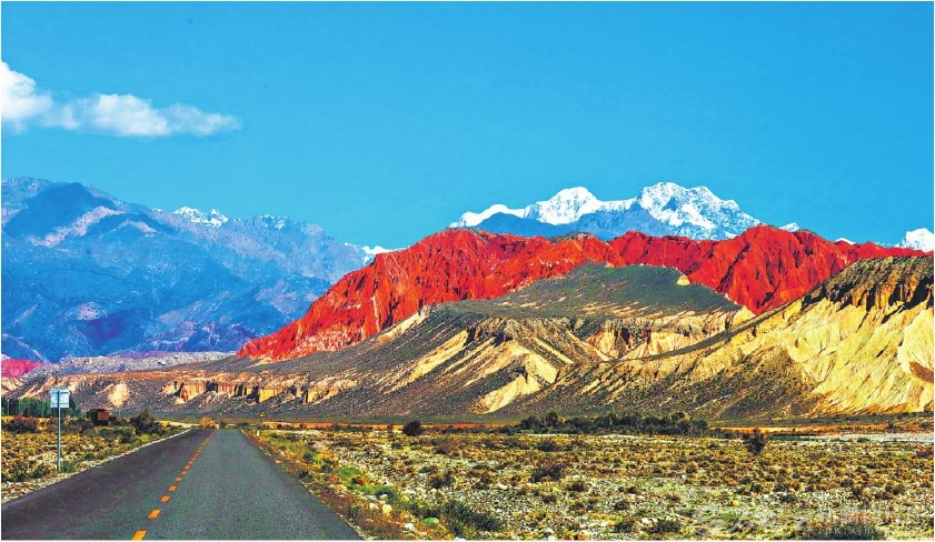 初秋的天山托木尔景区壮美如画,山体在蓝天映衬下绚丽多彩,公路蜿蜒伸向远方,勾勒出独特的风光(8月28日摄)。 □王举南摄