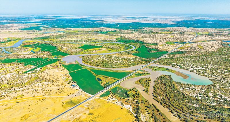 在塔克拉玛干沙漠边缘的尉犁县境内,塔里木河蜿蜒流淌,两岸胡杨生机勃勃,形成了一幅绝美的生态画卷(8月27日无人机摄)。近年来,当地通过实施生态输水、胡杨林抚育、围栏封育等措施,有效保护了生物的多样性。 □汪志鹏摄