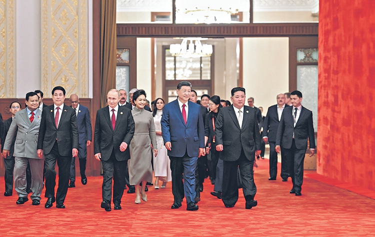 在喜庆欢乐的乐曲声中,习近平同中外嘉宾一起举杯,共同庆祝中国人民抗日战争和世界反法西斯战争的伟大胜利,共同祝愿世界和平。