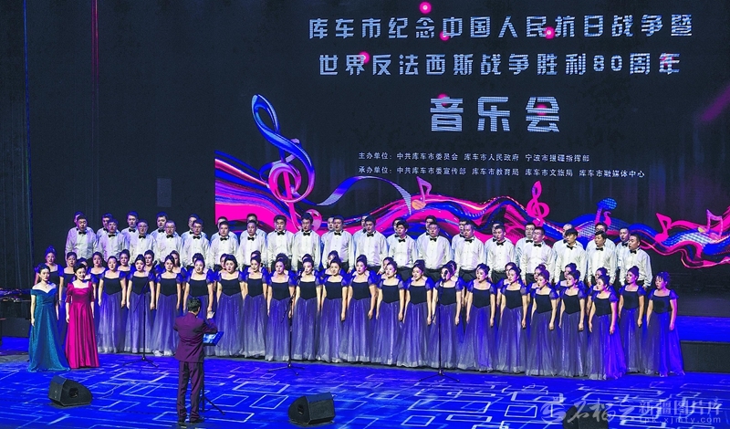 近日,库车市举办以“纪念中国人民抗日战争暨世界反法西斯战争胜利80周年”为主题的音乐会,弘扬伟大抗战精神。图为演员们在表演大合唱《游击队歌》。 □袁欢欢摄