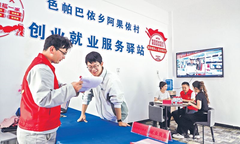 9月3日,在阿合奇县色帕巴依乡阿果依村创业就业服务驿站,党员干部向返乡高校毕业生介绍就业岗位情况。阿合奇县聚焦劳动者就业创业需求,高标准建设创业就业服务驿站,将政策咨询、岗位对接等“一站式”服务延伸至群众家门口。 □古丽加马力·艾萨摄