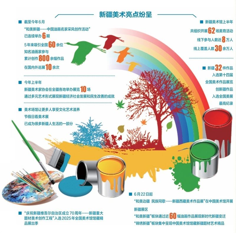 如今,新疆正日益成为艺术创作的沃土。越来越多美术作品在这片辽阔土地上诞生,以更主动、更鲜活的方式融入日常。与此同时,国内许多重要美术展览也纷纷来到新疆,优秀作品的双向流动,不仅丰富了新疆大众的审美体验,更让新疆故事、新疆之美通过艺术的桥梁,走向更广阔的天地。
