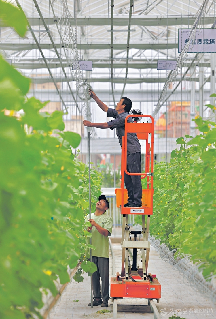 9月11日,工作人员在哈密市哈密瓜鲜果产业链平台服务中心的大棚里护理瓜秧。该中心以种质研发、标准认证、冷链物流、品牌流量推广和结算金融五大中心为基础,打造面向全国的特色鲜果产业平台。 □石榴云/新疆日报记者李瑞摄