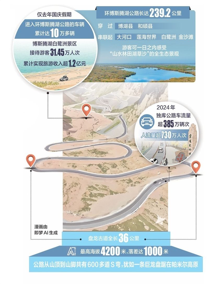 以独库公路为例,2024年,独库公路车流量超385万辆次、人流量超730万人次。当自驾游客踩下油门,车轮卷起的不仅是天山的沙石,更是沿线经济的蓬勃生机。