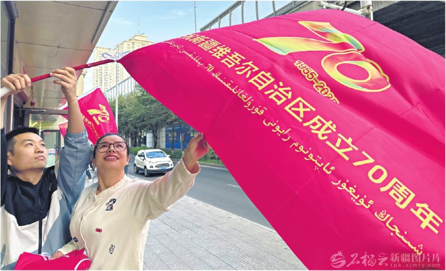 9月15日,乌鲁木齐市沙依巴克区八一街道办工作人员悬挂旗帜,迎接新疆维吾尔自治区成立70周年。 □石榴云/新疆日报记者韩亮摄