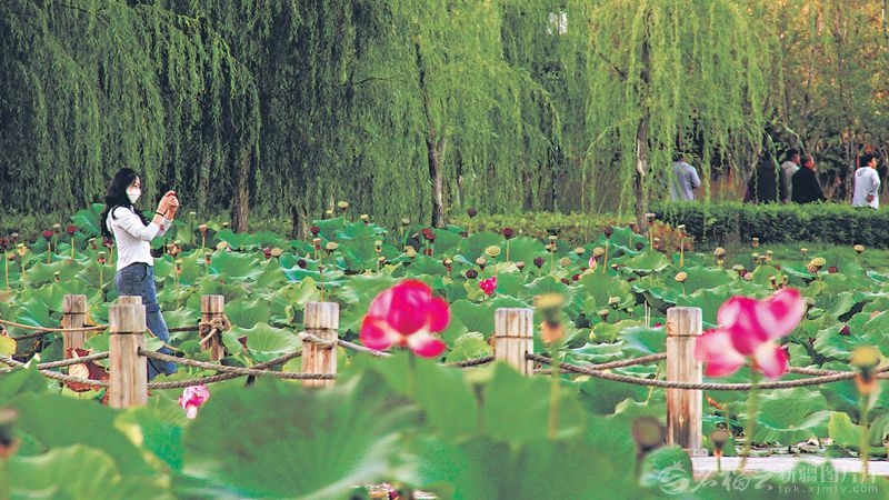9月13日,游客在塔城市千泉湖公园欣赏荷花。进入秋季,千泉湖公园的一池秋荷褪去了夏季的碧绿,莲蓬和荷花在荷塘里相映成趣,美不胜收。□杨化光摄