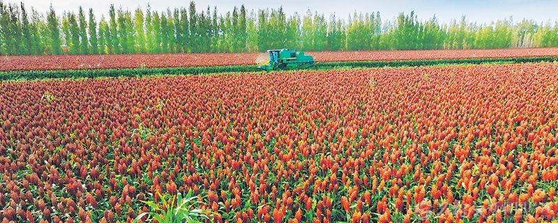 金秋时节,兵团第五师84团1700多亩红高粱迎来丰收,大型收割机在田间穿梭作业,呈现出一派喜人的丰收图景。□孙明亮摄