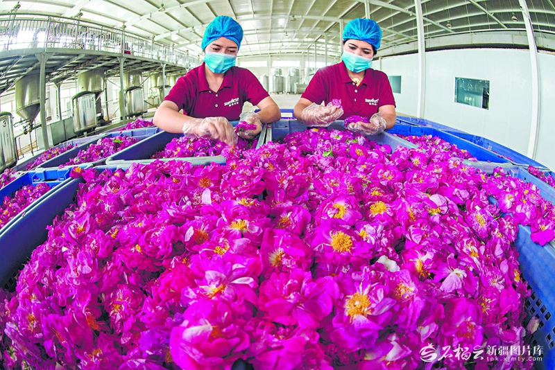 5月19日,工人在位于和田市的新疆和田阳光沙漠玫瑰有限公司车间分拣玫瑰花。当地通过发展玫瑰花产业,实现经济效益与生态效益双赢。□石榴云/新疆日报记者约提克尔·尼加提摄