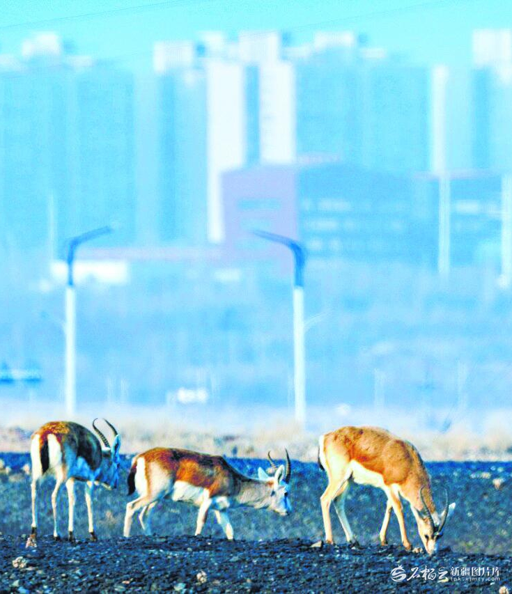 鹅喉羚在位于克拉玛依市区西郊的西戈壁公园漫步(2024年3月11日摄)。 □闵勇摄
