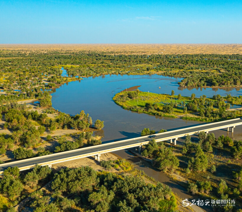 塔里木河中下游尉犁段,河水蜿蜒穿桥而过,两岸胡杨林生机勃勃(2023年8 月17日无人机摄)。 □汪志鹏摄