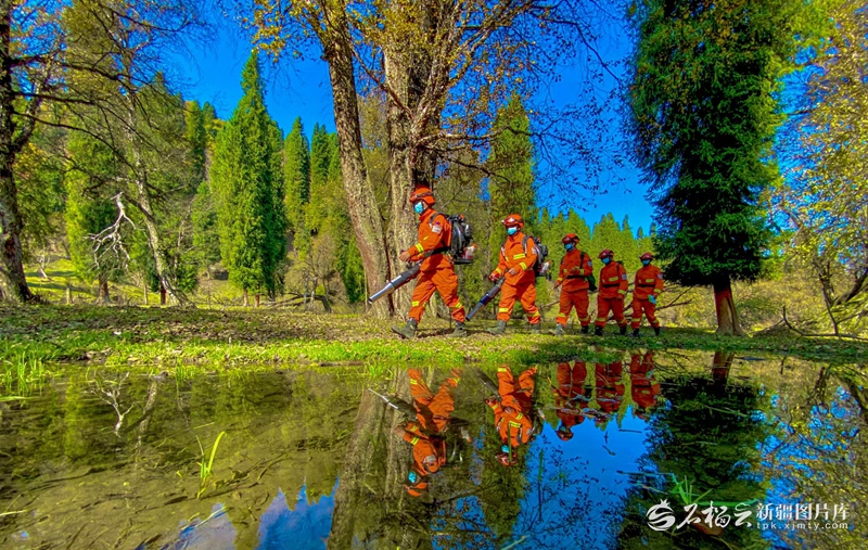 伊犁哈萨克自治州森林消防支队巩留大队消防员在库尔德宁风景区巡护(2022年4月20日摄)。 □刘杰摄
