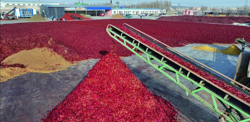 在农产品融合示范园,新疆宏运生物科技有限公司内机器轰鸣,工人在生产线各环节忙碌着。该公司负责人张明平说:“公司产品有辣椒籽、辣椒粉和辣椒颗粒等,主要销往山东、河南、河北等地,今年预计收购辣椒原料6000余吨,生产工业辣椒产品3600余吨。”