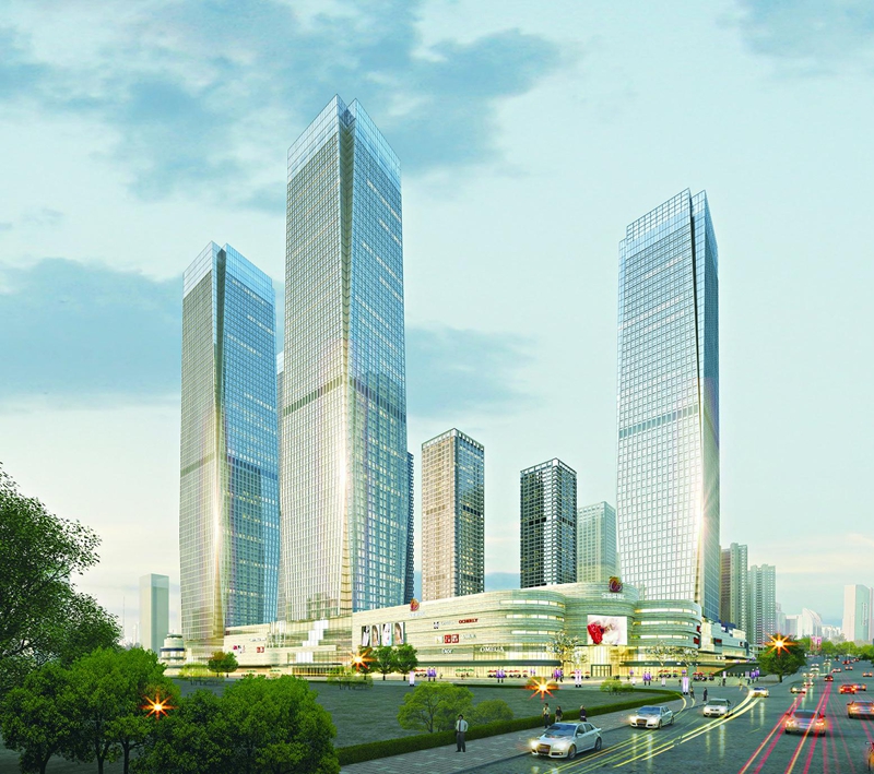 这栋双子塔楼脚下的5层裙楼呈雄鹰展翅状,“一鹰四翅”建筑造型巧夺天工,建筑群雄伟壮观,巨大的“雄鹰”商业综合体也已封顶,计划明年国庆节开门揖客。