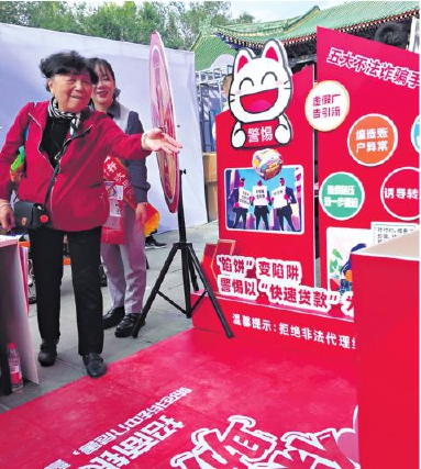 9月15日,招商银行乌鲁木齐分行在乌鲁木齐市人民公园开展金融知识宣传活动。图为市民参与金融安全卫士沙包投掷答题游戏。