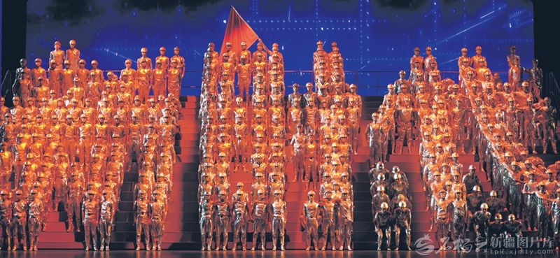 创意诗舞画《时代交响》以400位演员组成的银光矩阵为背景,运用灯光技术展现新疆高质量发展的成就——戈壁滩上“风”“光”无限,西电东送、西气东输跨越千里,柯柯牙披上绿装,塔克拉玛干沙漠戴上了“绿围脖”,“东数西算”汇聚时代热浪。