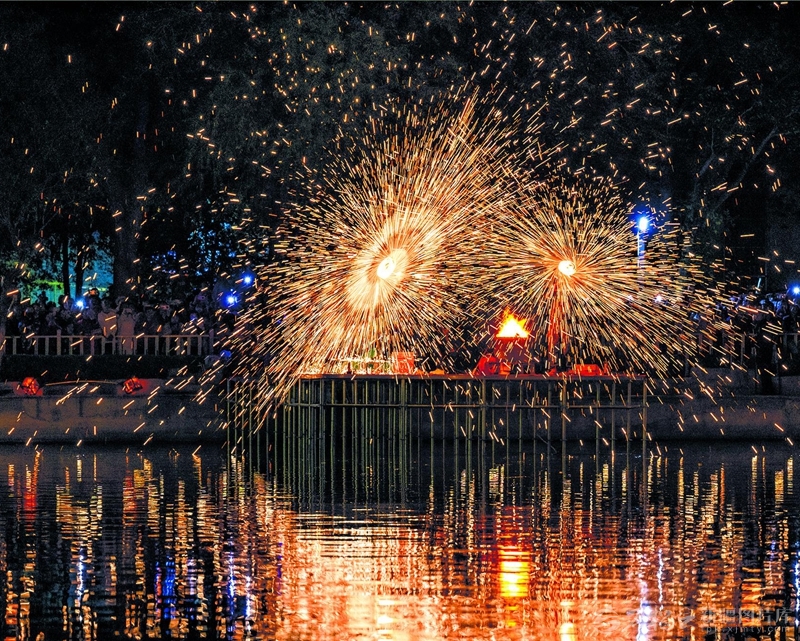 10月1日,昌吉市人民公园举行非遗打铁花表演,吸引了很多游客前来观赏。□何龙摄