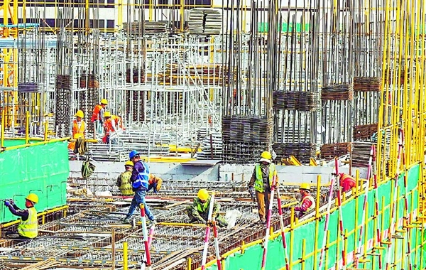 10月6日,在国际路港物流服务园区CD地块二区项目,中建三局施工人员正在施工。该园区建成后,将有力提升乌鲁木齐国际陆港区多式联运能级,推进铁路、公路、航空高效衔接。 □石榴云/新疆日报记者约提克尔·尼加提摄