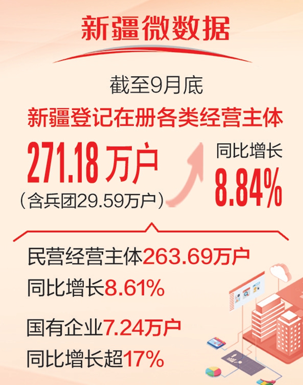 本报乌鲁木齐10月16日讯 石榴云/新疆日报记者索蓉芝从自治区市场监督管理局获悉:截至今年9月底,新疆登记在册各类经营主体达271.18万户(含新疆生产建设兵团29.59万户),注册资本(金)7.9万亿元,同比分别增长8.84%、8.48%,呈现量质齐升良好发展态势。