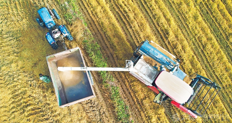 农机手驾驶收割机在温宿县的稻田里收割水稻(10月18日无人机摄)。目前,温宿县8万余亩水稻进入集中收获期,该县组织人力、机械积极抢收,预计11月上旬完成收割。 □王举南摄