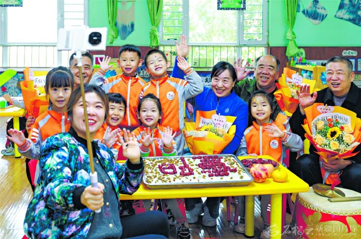 10月23日,孩子们与爷爷奶奶一起合影。当日,乌鲁木齐市沙依巴克区环卫路街道环卫路社区开展“九九重阳节,浓浓敬老情”主题活动,孩子们与老人一起唱歌、玩游戏、做重阳糕,传递敬老情。□孙振嵩摄