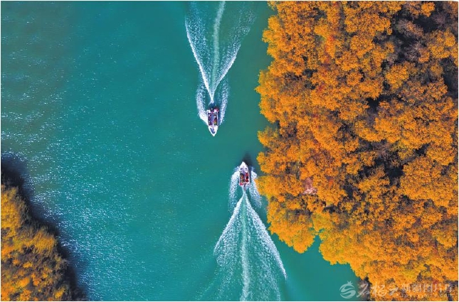 10月25日,游客在泽普县金湖杨景区乘游艇在胡杨林间游览。金秋十月,该景区胡杨披上金装,层林尽染,吸引了不少游客前来打卡。 □张昀摄