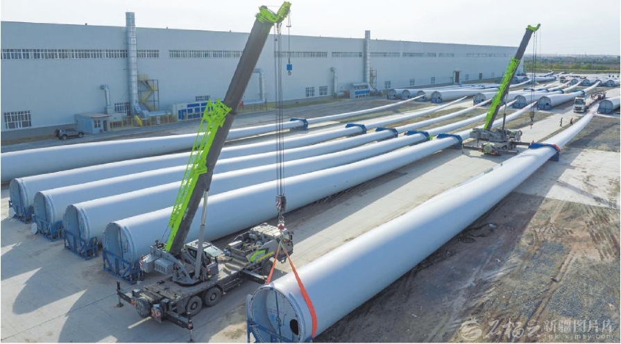 10月21日,工人在位于昌吉国家高新技术产业开发区的新疆成飞新材料有限公司风电叶片生产基地作业。目前,该企业4条百米级风电叶片生产线正满负荷运转赶制订单,预计年产值可突破6亿元。 □何龙摄