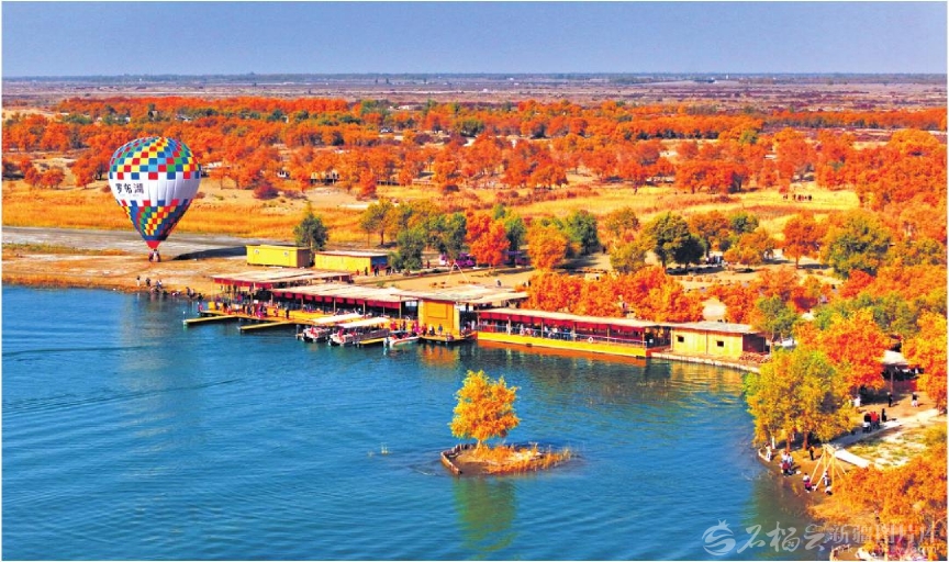 10月25日,游人在尉犁县塔塔秘境国际旅游度假区赏景。日前,该度假区胡杨染金,秋景如画,吸引游客纷至沓来。 □谭辉摄