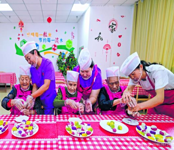 10月28日,在呼图壁县园户村镇农村幸福大院内,工作人员与老人共同制作重阳糕。 □陶维明摄