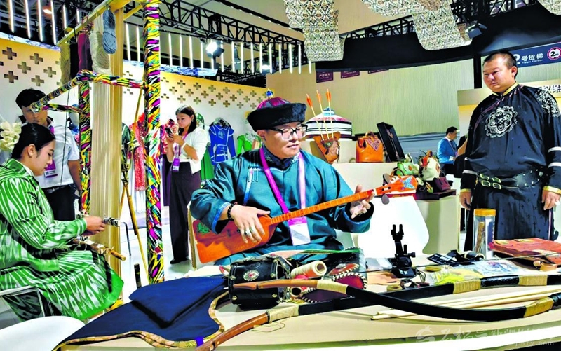 入选全国民间文艺版权保护与促进试点地区的察布查尔锡伯自治县展台上,陈列着创刊于1946年的《察布查尔报》新旧合订本原件——这是我国乃至全球唯一的锡伯文报纸。从纸张泛黄的黑白印刷到套色彩印报纸,竖排版的锡伯文不仅记录着锡伯族的历史变迁,更见证了锡伯族文化在中华文化大家庭里共生共荣的历程。展区内,国家通用语言文字与锡伯文对照书写的《中国梦》《中华一家亲》书法作品格外引人注目,工作人员徐明向观众介绍:“锡伯文书法深受中原文化影响,那边是锡伯文隶书,这边是锡伯文楷书。”