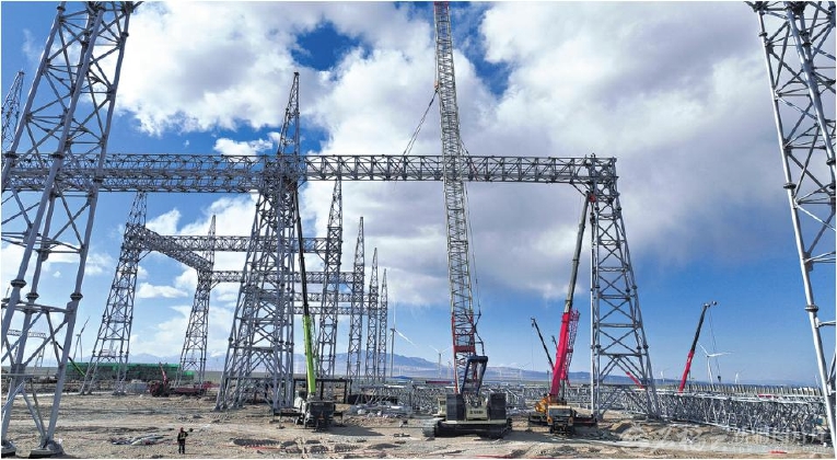 10月31日,电力员工在若羌县祁曼750千伏变电站新建工程吊装构架。该工程是一座在建的高海拔750千伏变电站,投运后将满足若羌县祁曼区域300万千瓦新能源项目的消纳需求。□马元摄