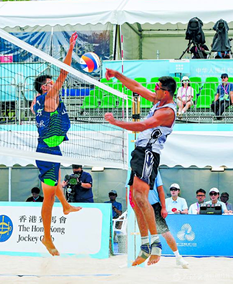 11月3日,沙排运动员场上比拼。当日,第十五届全国运动会沙滩排球项目男子C组第18场比赛,在香港维多利亚公园赛场展开角逐。新疆一队组合阿卜杜哈力克江·穆太力普/萨拉木·艾哈买提直落两局,以2∶0力克山东二队组合,斩获小组赛关键胜利。 □石榴云/新疆日报记者蔡增乐摄