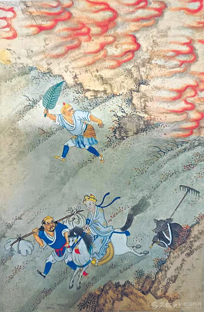 作为玄奘西行路上的必经之地,新疆丰富多样的地貌特征为《西游记》创作提供了独特的素材,极大地增强了作品奇幻色彩的表现力度,丰富和增强了九九八十一难的困难程度和深刻寓意。“八百里火焰,四周围寸草不生”的火焰山、“鹅毛飘不起,芦花定底沉”的八百流沙界,“千层汹浪滚,万迭峻波颠”的通天河,饮水成胎的子母河,借由《西游记》的妙笔,幻化成为一段段惊心动魄、摄人心神的经历。作品突显自然景致严峻险要的同时,一方面着力刻画了人与自然的对抗和挑战妖魔的百折不挠,孙悟空为灭火焰山之火,三借芭蕉扇;为过通天河,两战灵感大王,虽然险象环生,却从不退缩;另一方面侧重体现对心魔的抵抗和斗争,唐僧在女儿国接连两番遇到了富贵温柔乡的诱惑,一次来自人世间的西凉女王,一次来自琵琶精,面对女王时不禁“似醉似痴”,动了心神,好在最后都能够坚守本性,把持正身。